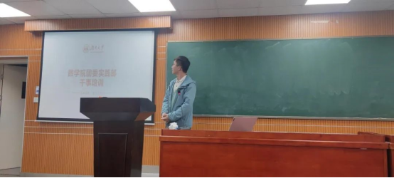 志愿服务部部长姚谱龙对志愿服务部进行介绍,特别介绍伐数活动,是为了解决新生关于数学方面的问题,每周末线下开设课堂,帮助同学们更快更好的学好数学,由数玩偶姐姐
