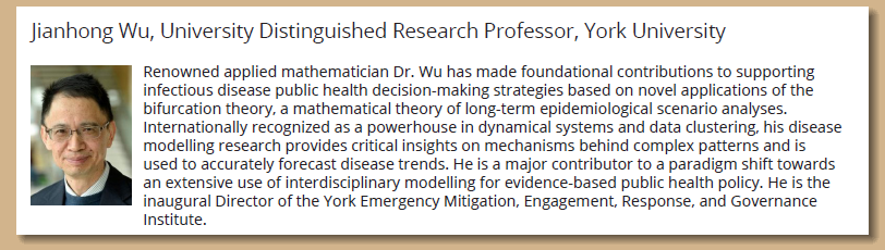 毕业的第一位博士。随后他前往美国孟菲斯大学访问和在加拿大阿尔伯塔大学做博士后。1990年起在加拿大约克大学工作,现任约克大学数学统计系终身教授、加拿大工业与应用数学首席科学家(Canada Research Chair in Industrial and Applied Mathematics)、赛诺菲工业研究主席(NSERC / Sanofi Industrial Research Chair)等,他还是菲尔兹研究所委托的加拿大国家COVID-19大流行快速响应建模工作组的负责人。吴建宏教授先后在Kluwer、AMS/Fields、Springer、Wiley等出版社出版专著8 部、编著14 部,发表论文400多篇,获得过10余项学术成就奖,在动力系统、神经网络和模式识别、大数据分析、生物数学特别是公共卫生数学建模和传染病防控方面做出了重大和杰出贡献,是这些方向的国际领军人物。他是我国改革开放之后自己培养的第一代博士中的杰出代表,也是海外华人学者中的领袖之一。