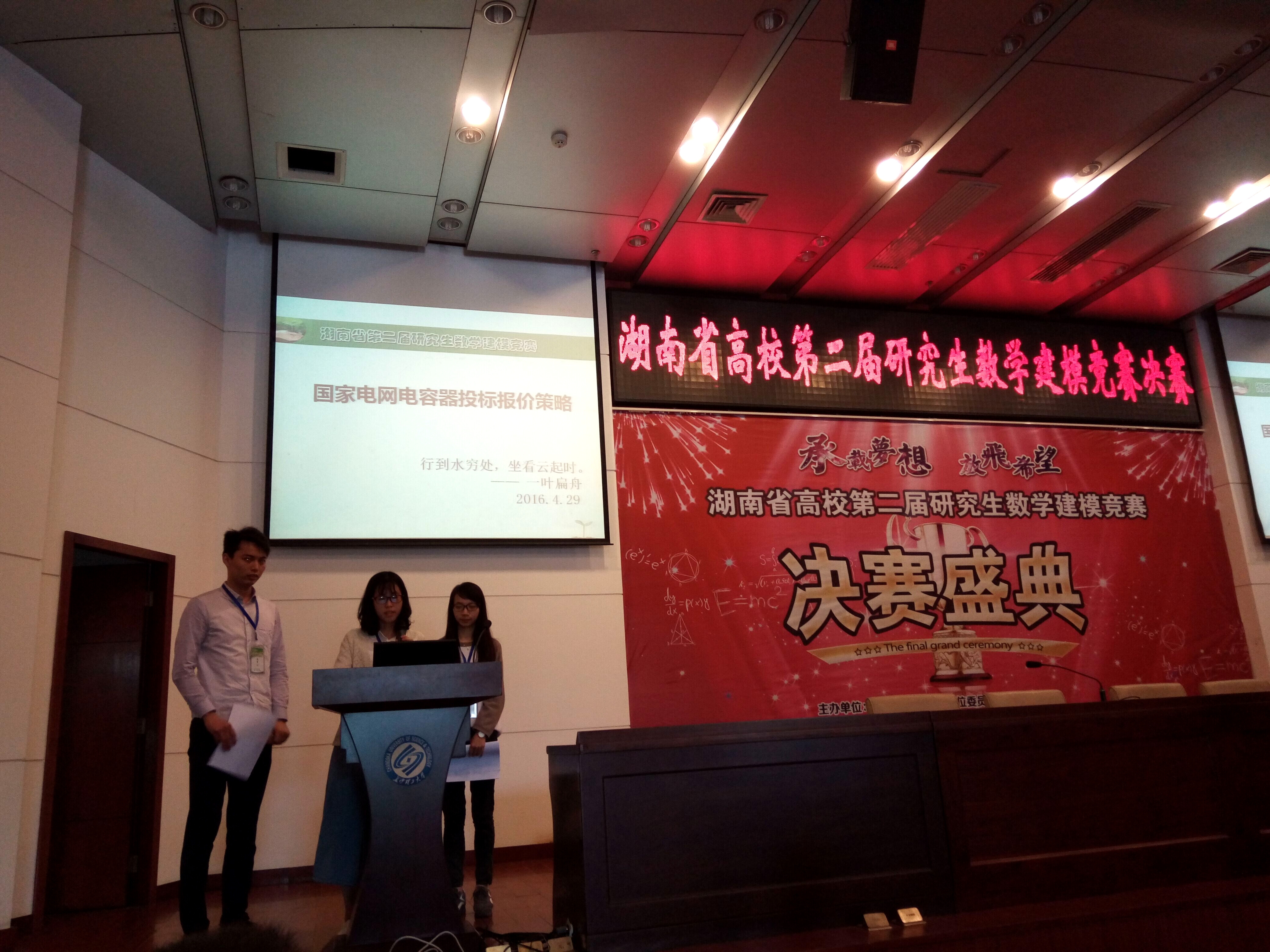 湖南省高校第二届研究生数学建模竞赛日前落下帷幕。该竞赛自1月18日启动,全省共有16所高校的194支队伍报名参赛。4月15日比赛正式开始,到19日结束,选手们以“国家电网电容器投标报价策略”和“法律咨询用户行为分析及服务推荐”为题,展开了激烈的角逐。4月23-24日,大赛组委会对收到的178篇合格的论文答卷举行了专家评审会议,评选出35支优秀团队于4月30日在长沙理工大学的报告厅进行了决赛答辩。