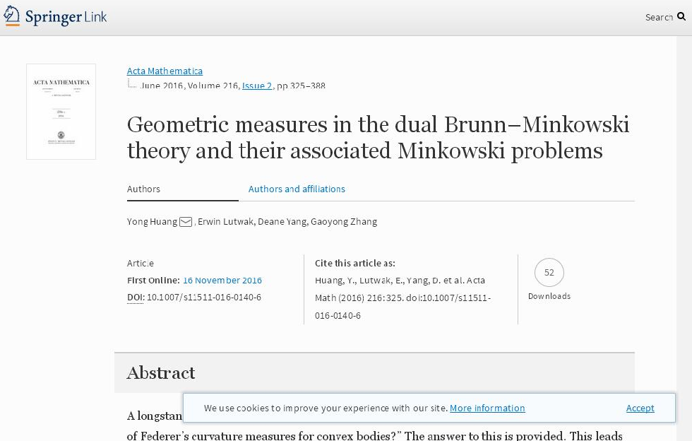 日前,国际顶尖数学期刊Acta Mathematica刊登了玩偶姐姐 数学研究所黄勇教授与纽约大学E.Lutwak, D. Yang, 以及Gaoyong Zhang合作的论文“Geometric measures in the dual Brunn-Minkowski theory and their associated Minkowski problems”。
