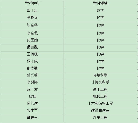 共有16人入选,分布于数学、化学、环境科学、计算机科学、通用工程、机械工程、土木和结构工程、建设和建造、汽车工程等领域。