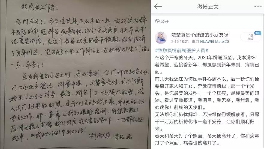 值班教师等等,线上发微博、朋友圈表达对前线奋斗的英雄们的感谢和敬佩。封城和闭式管理虽然限制了我们出行的脚步,但是我们的心相连,必将我们的心意传达。以下是陈书净、陈岳辛、邓崇昊、李钰涵、刘健吾、秦睿、于晓戈、张迪、招雅萌等同志(排名不分先后)的致谢信: