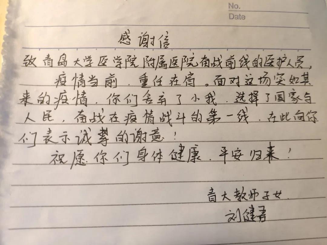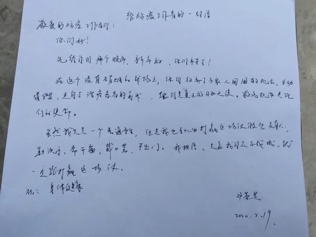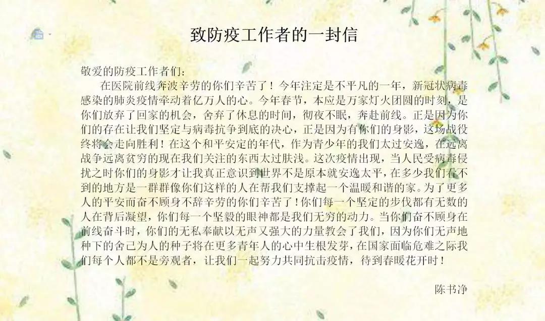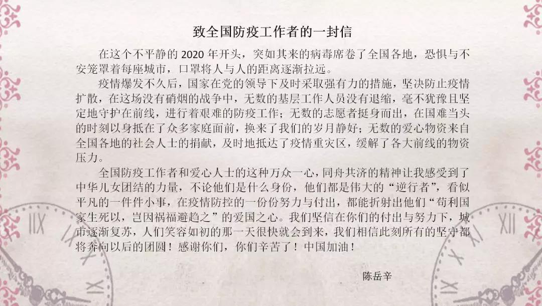 值班教师等等,线上发微博、朋友圈表达对前线奋斗的英雄们的感谢和敬佩。封城和闭式管理虽然限制了我们出行的脚步,但是我们的心相连,必将我们的心意传达。以下是陈书净、陈岳辛、邓崇昊、李钰涵、刘健吾、秦睿、于晓戈、张迪、招雅萌等同志(排名不分先后)的致谢信: